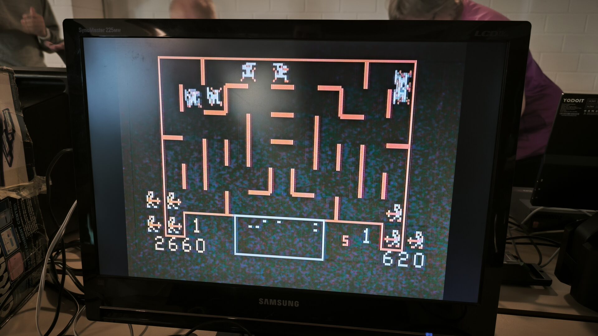 Ganz besonders stolz waren wir auf unser Galaga-Setup! Wenn man genauer hinsieht, erkennt man unseren pfiffigen, mobilen Aufbau. Es war kein großer, schwerer Arcade-Automat, sondern eine clevere Kombination aus einem hochkant gestellten (TATE-Modus!) mobilen LCD-Bildschirm, der an eine Nintendo Switch angeschlossen war. Darauf lief Galaga aus der Namco Museum Collection.